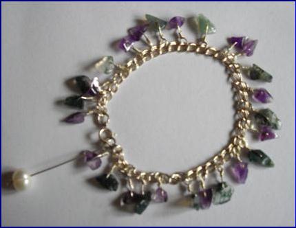 Materials: 925 sterling silver charm bracelet, 38mm head pins thick, 0.60mm wire; moss agate, amethyst, culture fresh water pearl