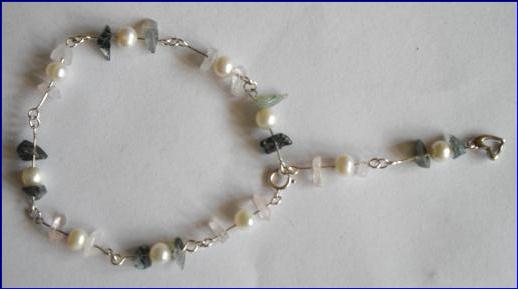 Materials: 925 sterling silver 0.60mm wire, 4mm jump ring, 6mm bolt ring clasp, open heart charms; cultured fresh water pearls, rose quartz, moss agate