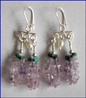 Materials: 925 sterling silver 0.40mm-0.60mm wire, spacer, kidney wire; cultured fresh water pearls, malachite, amethyst