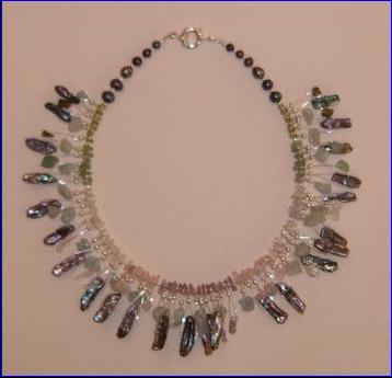 Materials: 925 sterling silver 0.60mm-0.40mm wire, 3mm-2mm beads, 12mm bolt ring clasps; cultured fresh water pearls, peridot, rose quartz, amethyst, aqua marine, moonstone, clear quartz
