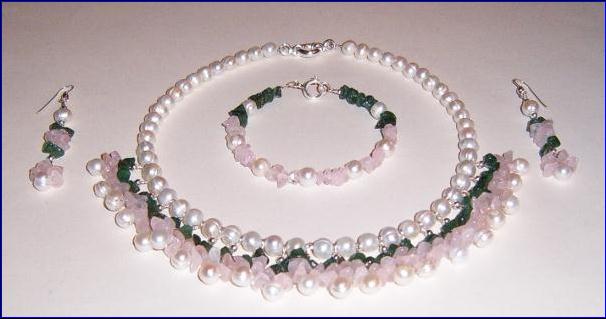 Materials: 925 sterling silver 0.60mm, 0.40mm wire, 3mm, 9mm bolt ring clasps, 5.5mm close jump rings; cultured fresh water pearls, rose quartz, aventurine