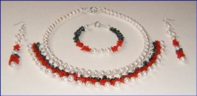 Materials: 925 sterling silver 0.60mm-0.40mm wire, 3mm beads, 12mm-9mm bolt ring clasps, 5.5mm close jump rings, fish hook earrings; cultured fresh water pearls, corals and moss agate