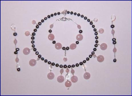 Materials: 925 sterling silver 0.60mm-0.40mm wire, 3mm- 2mm beads, 12mmbolt ring clasps, lever back earrings; cultured fresh water pearls, rose quartz.