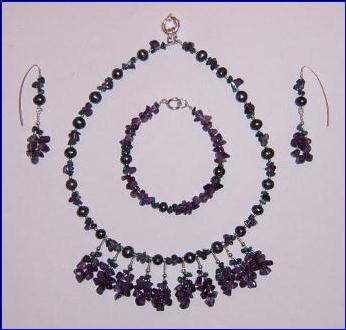Materials: 925 sterling silver 0.60mm-0.40mm wire, 3mm- 2mm beads, 12mm-9mm bolt ring clasps, 5.5mm close jump rings; cultured fresh water pearls, amethyst, malachite.