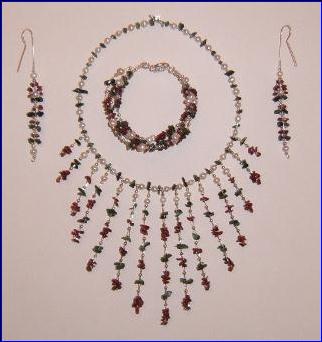 Materials: 925 sterling silver 0.40mm, 0.60mm wire, 12mm bolt ring clasps, 2mm-3mm beads, lever back earrings; cultured fresh water pearls, emerald and rubylite